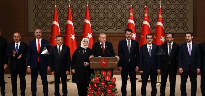 ضمت تشكيلة الحكومة الجديدة التي أعلنها (أردوغان) 16 وزيراً، ومن الملاحظ في هذه التشكيلة دمج بعض من الوزارات في بعض، فبعد أن كانت الوزارات 26 وزارة تحولت إلى 16 وزارة، كذلك ألغيت بعض الوزارات؛ كوزارة شؤون الاتحاد الأوروبي، إضافة إلى استمرار بعض الوزراء في مناصبهم السابقة، وذلك ربما بناء على أدائهم الجيد خلال الفترة الماضية، ومنهم وزيرا الخارجية والداخلية، في حين جاء تعيين بقية الوزراء بناء على تخصصاتهم في هذه المجالات، وأغلبهم تكنوقراط ولا علاقة لهم بالعمل الحزبي، ومن الملاحظ كذلك تعيين (خلوصي أكار)، الرئيس السابق لهيئة الأركان التركية، وزيراً للدفاع، وهذا يدل على ثقة القيادة السياسية بأدائه العسكري خلال الفترة الماضية، والذي أحدث تحولاً ملحوظاً على المستوى العسكري خارج الحدود؛ تمثل في استخدام القوة الصلبة لتأمين الأمن القومي التركي، ونشر عدد من القواعد العسكرية التركية خارج البلاد.